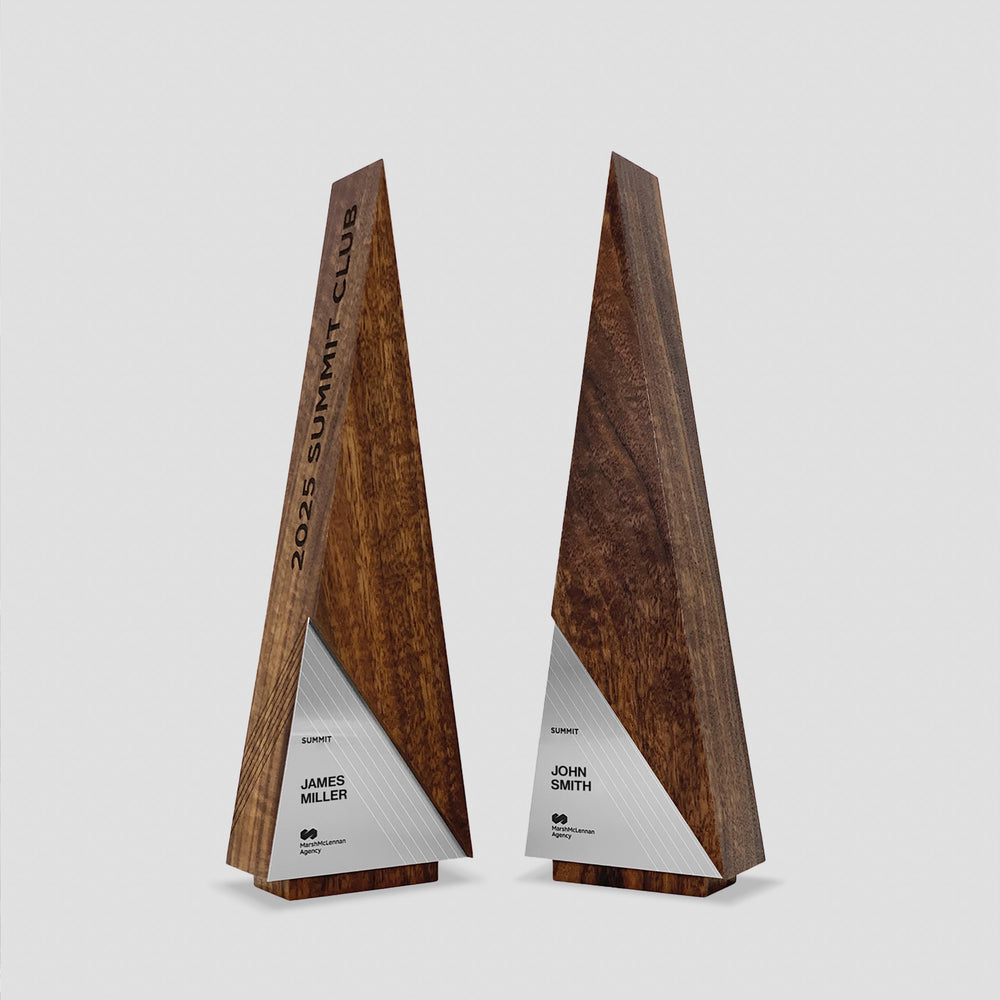 Our awards feature premium materials including kiln-dried and finished North American hardwoods, metal, acrylic, and glass. Each piece is architect-designed and artisan-crafted in our Austin, Texas studio for enduring quality and presence. We are happy to guide you on destination-specific requirements and preferred materials.